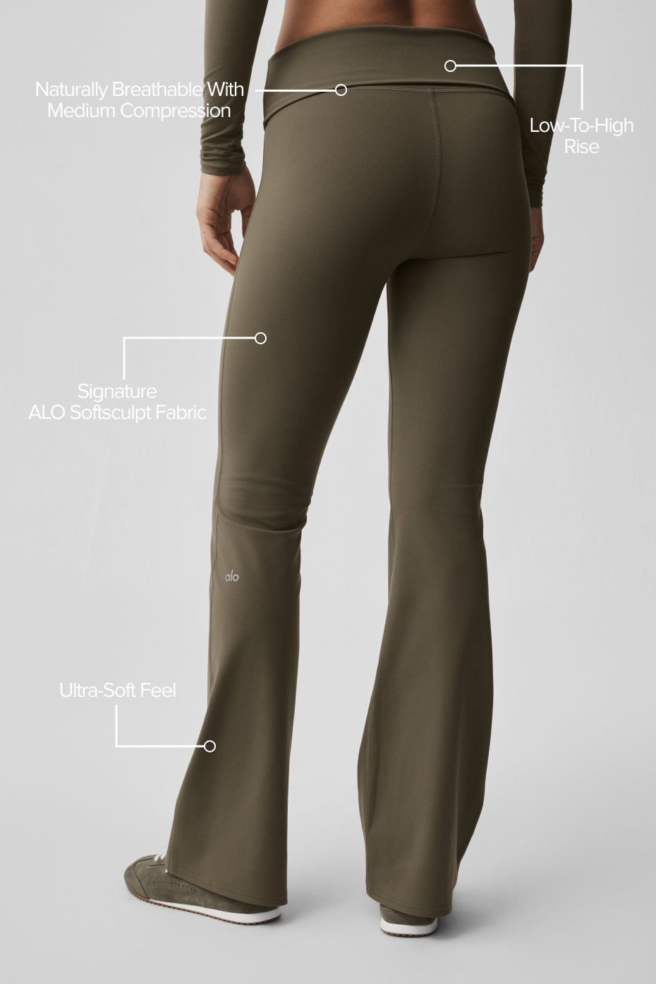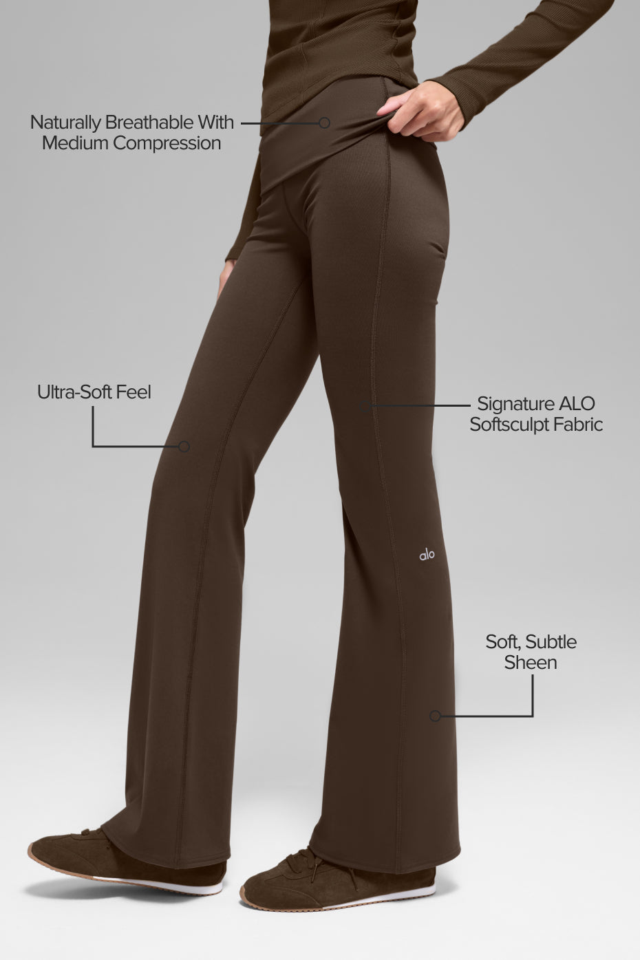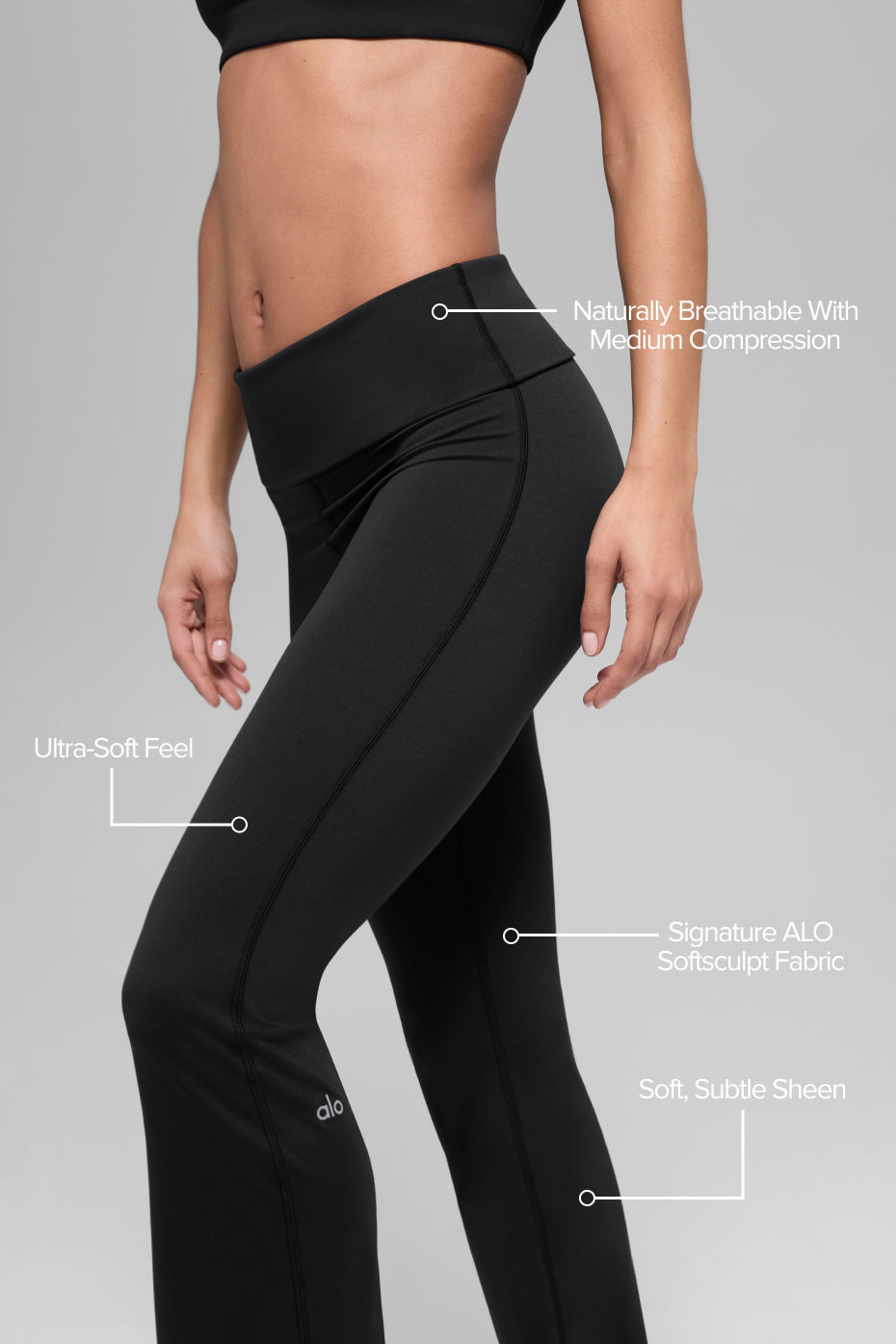 An icon returns—foldover leggings are so back. The ALO Softsculpt Foldover Flare Legging is crafted from our naturally-breathable signature fabric and features a foldover waistband that’s both flattering and nostalgic. The fabric has an subtle sheen and an ultra-soft feel that’s comfortable enough for all day wear. Designed with a subtle flare and a clean, sculpting fit, it moves effortlessly from studio to street with a timeless, throwback-inspired silhouette.