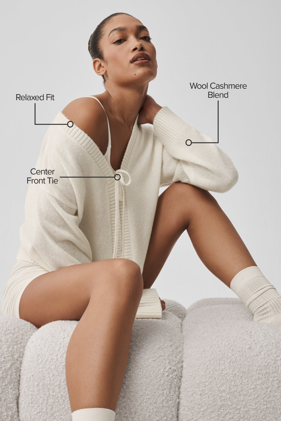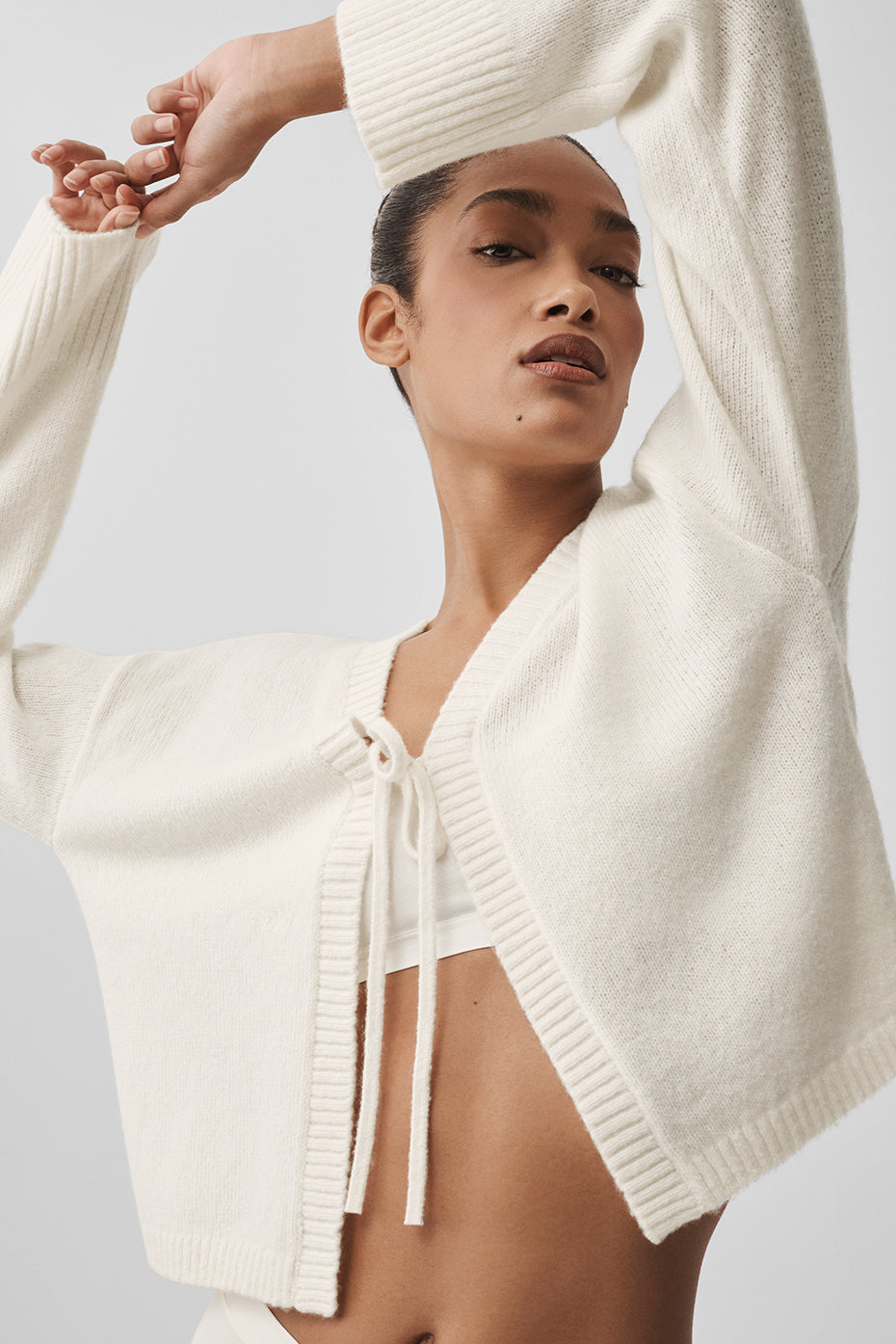 Soft structure meets effortless drape with the Wool Cashmere New Class Tie Cardigan. This style was designed to feel as refined as it is relaxed, with an easy, open silhouette and delicate front-tie closure that lets you style it your way. The lightweight fabric layers beautifully over bras and tanks, while the fluid shape moves seamlessly from slow mornings to styled-up evenings. Equal parts cozy and considered, it’s the kind of piece that finishes a look without trying too hard.