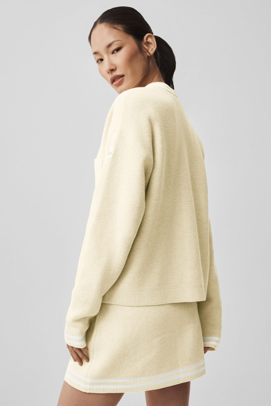 This is not your grandpa’s cardigan: Cut to fit the female form with a roomy drape, it has dropped shoulders, a four-button front, ribbed cuffs, and a hip-length hem. Striped trim gives it a classic yet cute look. And the best part? There's a whole Tennis Club capsule collection to style it with.