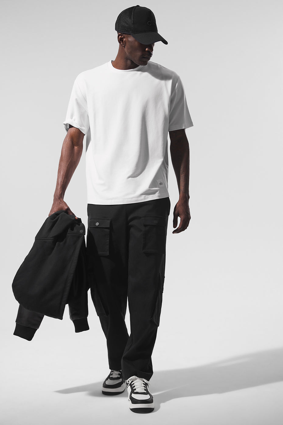 A fresh riff on Y2K style, these pants are made from soft, sturdy, stretch-infused cotton twill. They have four cargo pockets—peep how the lower pockets are slightly offset—with snap closures for stashing spare change or parking stubs. The roomy, straight-leg silhouette has an easy elastic waist with a drawstring. Top it all off with a hoodie and ALO sneakers.