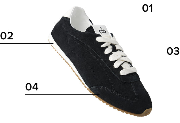 Low-profile aesthetic, recovery foam insole, premium suede, fashion-forward details.